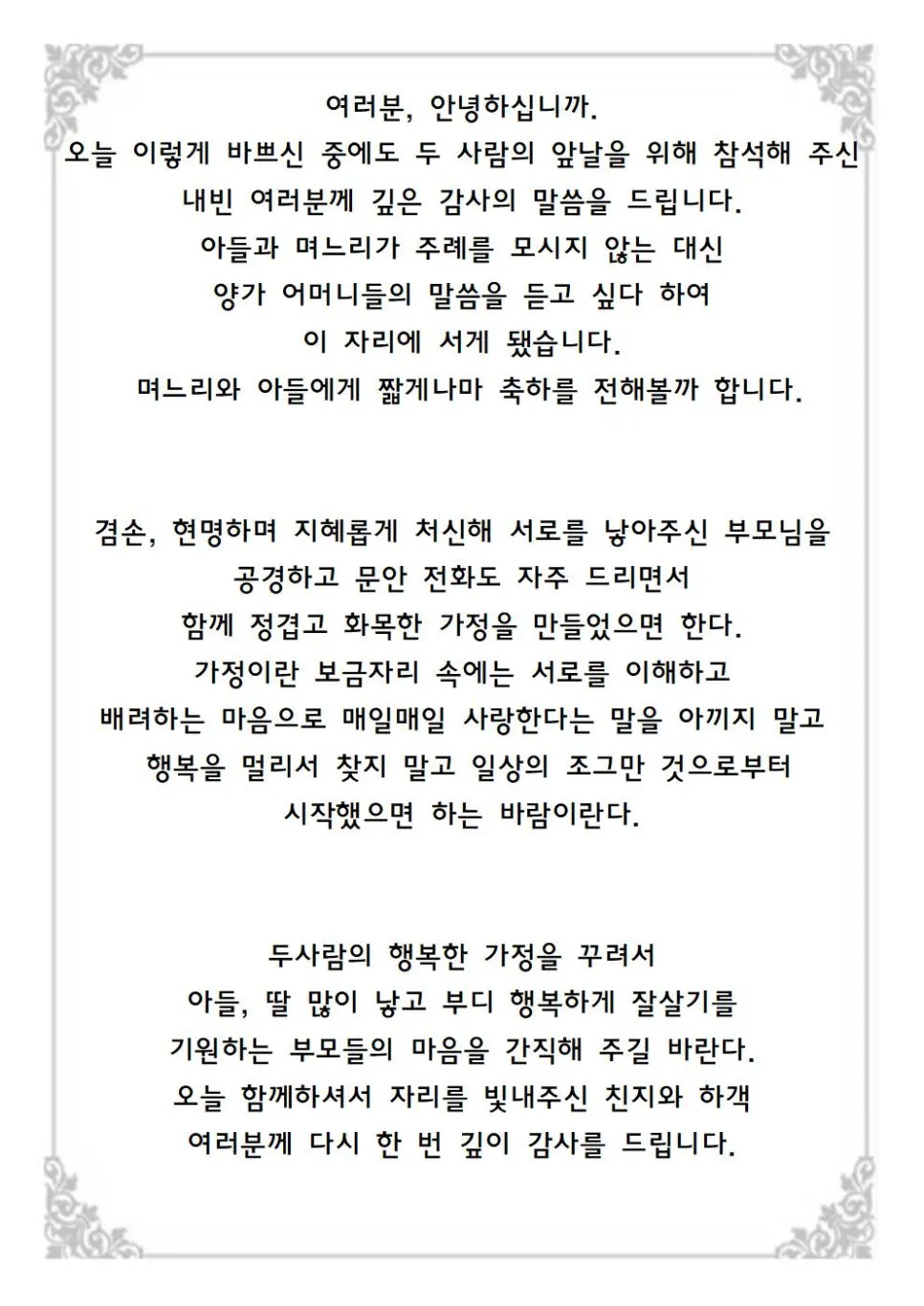 - 축가 및 축사 : 특별한 축가나 축사가 이어집니다.