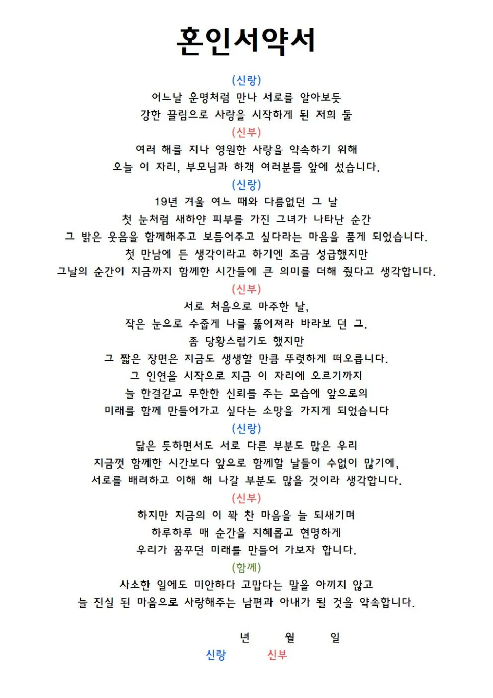 - 부부로서의 다짐 : 두 사람이 부부로서 함께 하겠다는 다짐을 포함합니다.
