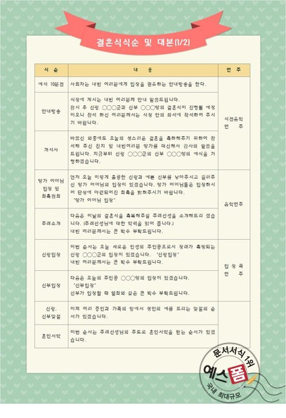 - 주례사 : 주례자가 결혼식의 의미와 두 사람의 사랑에 대해 이야기합니다.