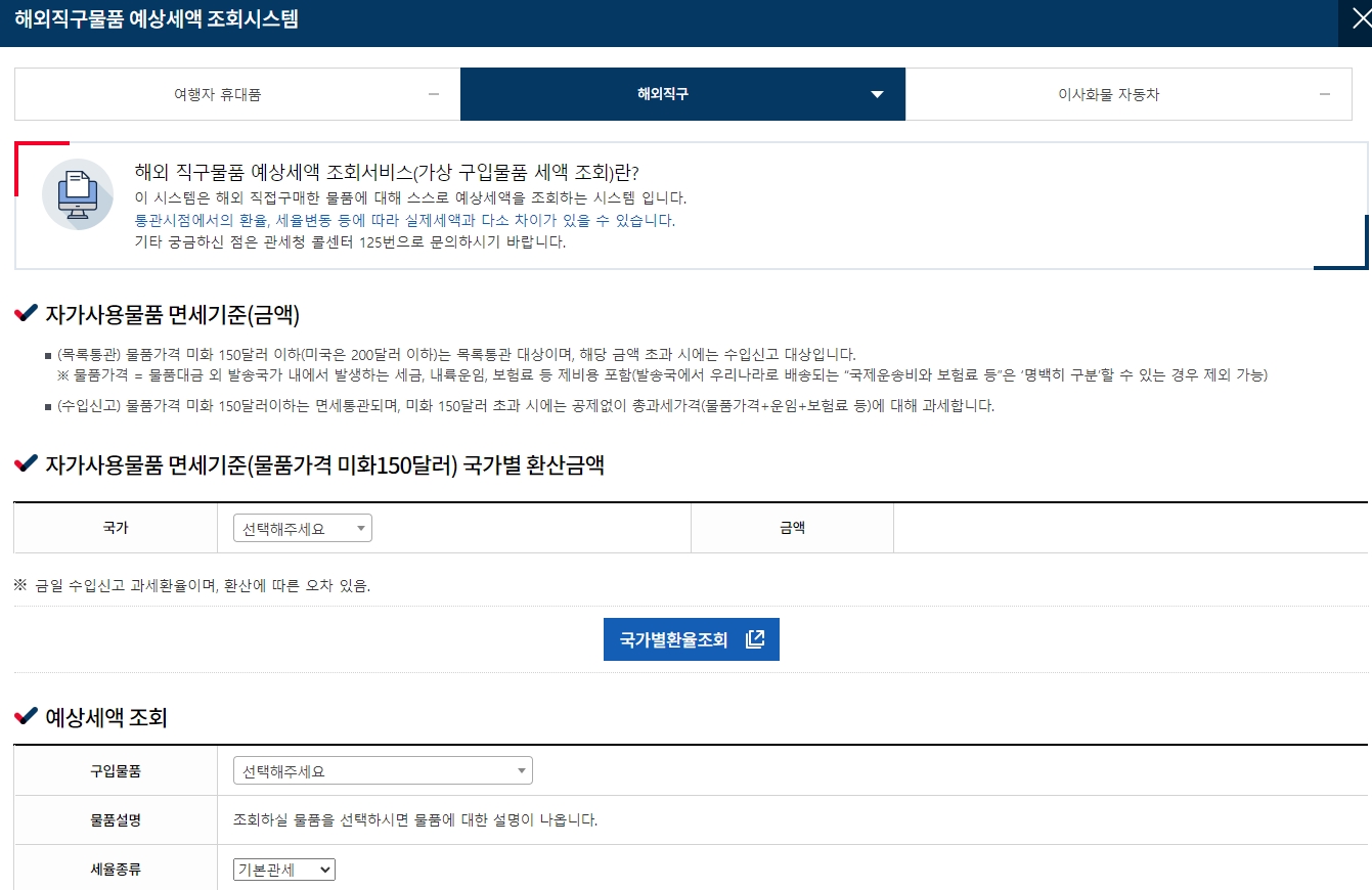 [3] 관세청 - 해외직구물품 예상세액 조회시스템 (https://www.customs.go.kr/kcs/ad/tax/BuyTaxCalculation.do)
