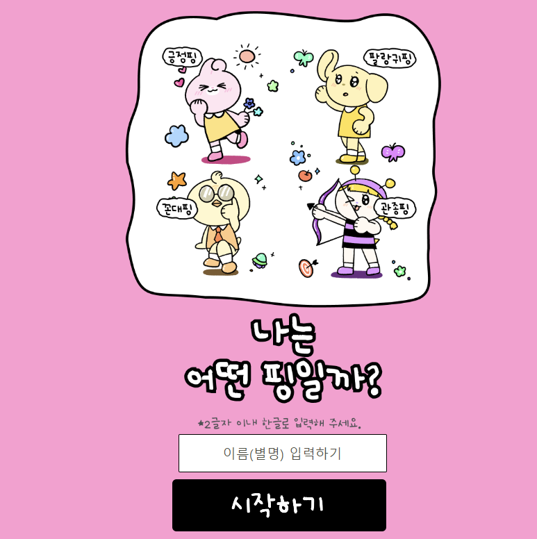 [1] 케이테스트 - 나만의 핑도감 성격 테스트 (https://ktestone.com/pingChar/)
